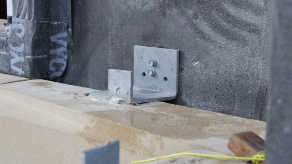 Typical stone veneer anchorage with split-tail anchor attached to steel stud backup.