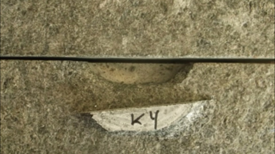 Results of split-tail anchor pullout test in kerf sawn in stone edge conducted in accordance with ASTM C1354.
