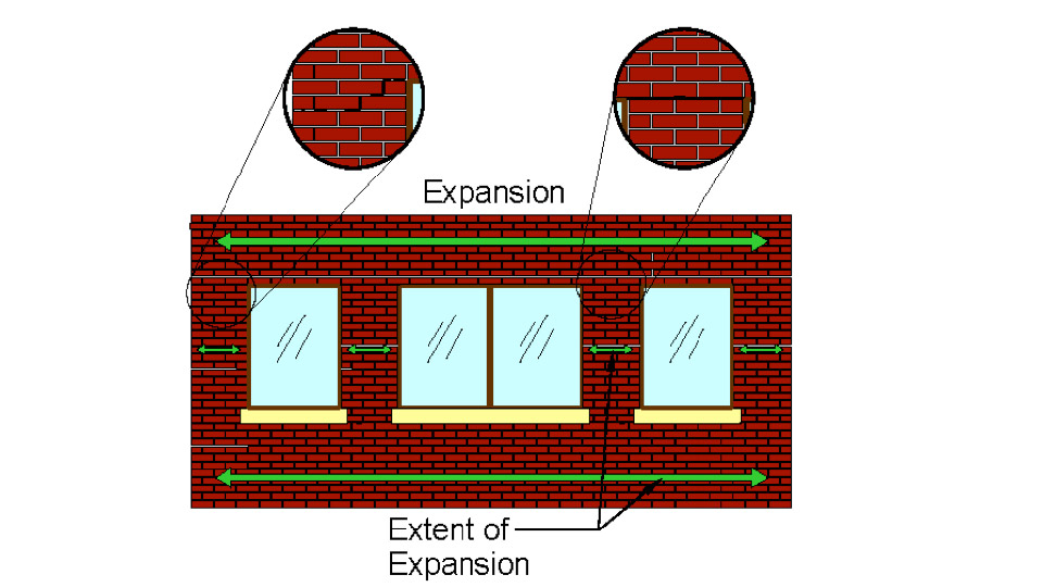 In addition to appropriate spacing, it is beneficial to locate expansion joints within a wall elevation at locations where expansion-related cracking would be most likely to occur. For example, uneven expansion around window and door openings can create stress concentrations and cracking that can be avoided by placing expansion joints at the corners of these openings (Figure 2). Similarly, expansion joints at changes in wall height or geometry can be especially effective.
