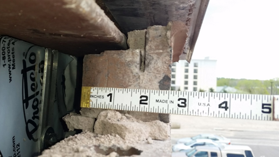 Another common expansion joint problem is improper or missing horizontal expansion joints (i.e. joints that accommodate vertical expansion). Clay brick and other masonry materials generally expand volumetrically, meaning they grow horizontally, vertically, and even through the wall thickness (although this direction is typically negligible). The most common need for horizontal expansion joints is beneath shelf angles or other intermediate supports in a multi-story building. Clay brick masonry veneer in this application tends to expand vertically over time and can be restrained by the shelf angle and building frame, which is not expanding and, in fact, generally shortens somewhat over time. If a compressible expansion joint of sufficient width is not provided between the top of the brick and the bottom of the shelf angle, the restrained expansion of the brick can cause bowing, cracking, and even collapse of the veneer (Figure 3).