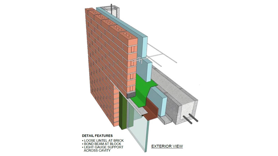 Loose lintel for support of the brick veneer and reinforced CMU lintel in the load-bearing backup (image courtesy of the International Masonry Institute’s Masonry Detailing Series).