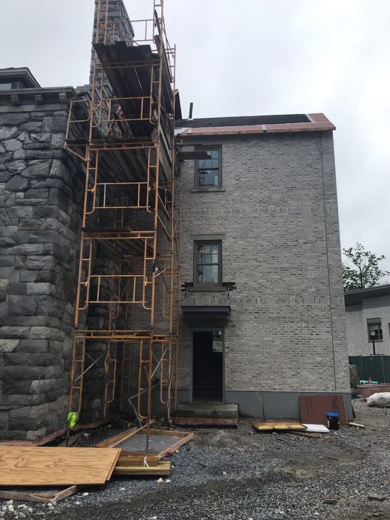 In addition to restoring the mortar of St. Anthony Hall, Cantarella & Son’s team had to erect a block elevator, a square casing for the elevator shaft, and install further block to the exterior of the building. They also refaced stairways that were originally finished with split-face block and had to use the exact same brick as the adjacent building.