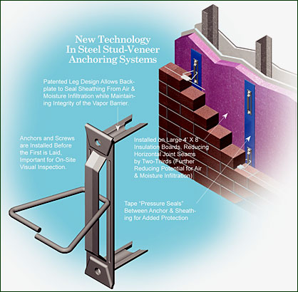 Maybe the biggest change has taken place with regard to potential air and moisture infiltration in the wall assembly, and, more important, how we deal with keeping the building envelope as dry and energy efficient as possible. Anchoring systems certainly have become a major part of a successful building envelope, but not only from the anchoring standpoint. Today's anchors must be compatible and function with all different types of both breathable and non-breathable air and vapor barriers. It is critical that the barrier's integrity not be impaired, so as to maintain indoor air quality while also contributing to the structure's energy compliance. In some cases, such as steel stud assemblies, the anchoring system will normally penetrate the air/vapor barrier and must provide an additional seal against air and moisture penetration at the outer-most point of the backup system. In CMU applications, the air/vapor barrier must be able to effectively seal around the previously installed anchors. In all cases the air/vapor barrier and the anchoring system need to be able to function properly together, thus requiring careful consideration during design and product selection.