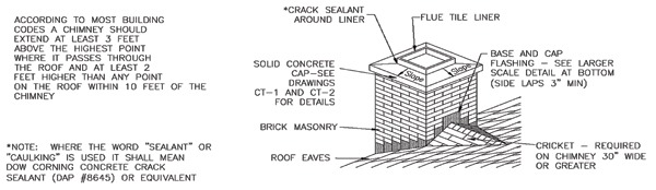 Masonry Chimney Weather ResistanceFlashing from the roof to the chimney is necessary to prevent water from leaking into the roof area where the chimney penetrates the roof. The “flashing” is normally inserted in two parts – step flashing, which is inserted under the roof shingles (or other roofing materials), and stepped counterflashing, which comes out of the chimney walls and turns down over the step flashing. The vertical legs of the flashing and counterflashing should be caulked with a construction sealant to prevent wind-driven rains from blowing into these areas. When the dimension of the chimney parallel with the roofline (usually regarded as the chimney width) exceeds 30 inches, a cricket is usually required. Use of a cricket for chimneys is effective in aiding roof drainage from behind wide chimneys, again minimizing contact time of the water with the chimney, and preventing ponding of water. Flashing materials should be metal – preferably copper, galvanized steel or stainless steel. Some plastics may be suitable, but are less durable. Omission of flashing and counterflashing at the roof/chimney intersection, and the substitution of construction sealants (caulks) for these materials, is considered inferior workmanship. The weather-resistance of the structure is unreliable in the absence of these materials. Masonry Chimney Weather Resistance