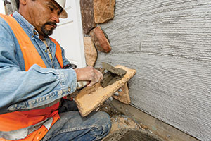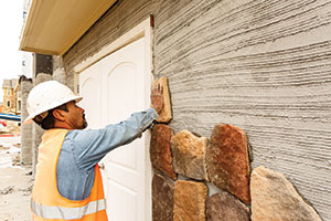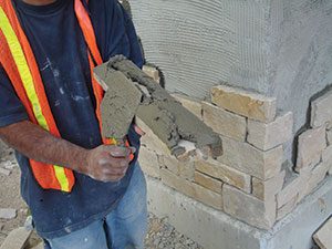 StoneCoat takes less time to install than cut or quarried stone and brick, at a rate of 600 to 800 square feet per day. It is lightweight at 6 pounds per square foot, making it less restrictive and less labor intensive than traditional brick and stone. It is self-supporting and does not require a brick ledge or a footing.
