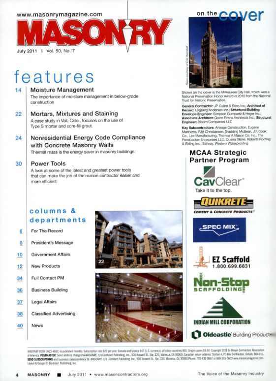 MASONRY (ISSN 0025-4681) is published monthly Subscription rate 529 per year, Canada and Mexico $47 (US. currency all other countries 565. Single copies $8.50. Copyright 2011 by Mason Contractors Association of America. POSTMASTER: Send address changes to MASONRY, c/o Lionheart Publishing, Inc, 506 Roswell St., Ste. 220, Marietta, GA 30060. Canadian return address Station A, PO Box 54 Windsor, Ontario MBA-615